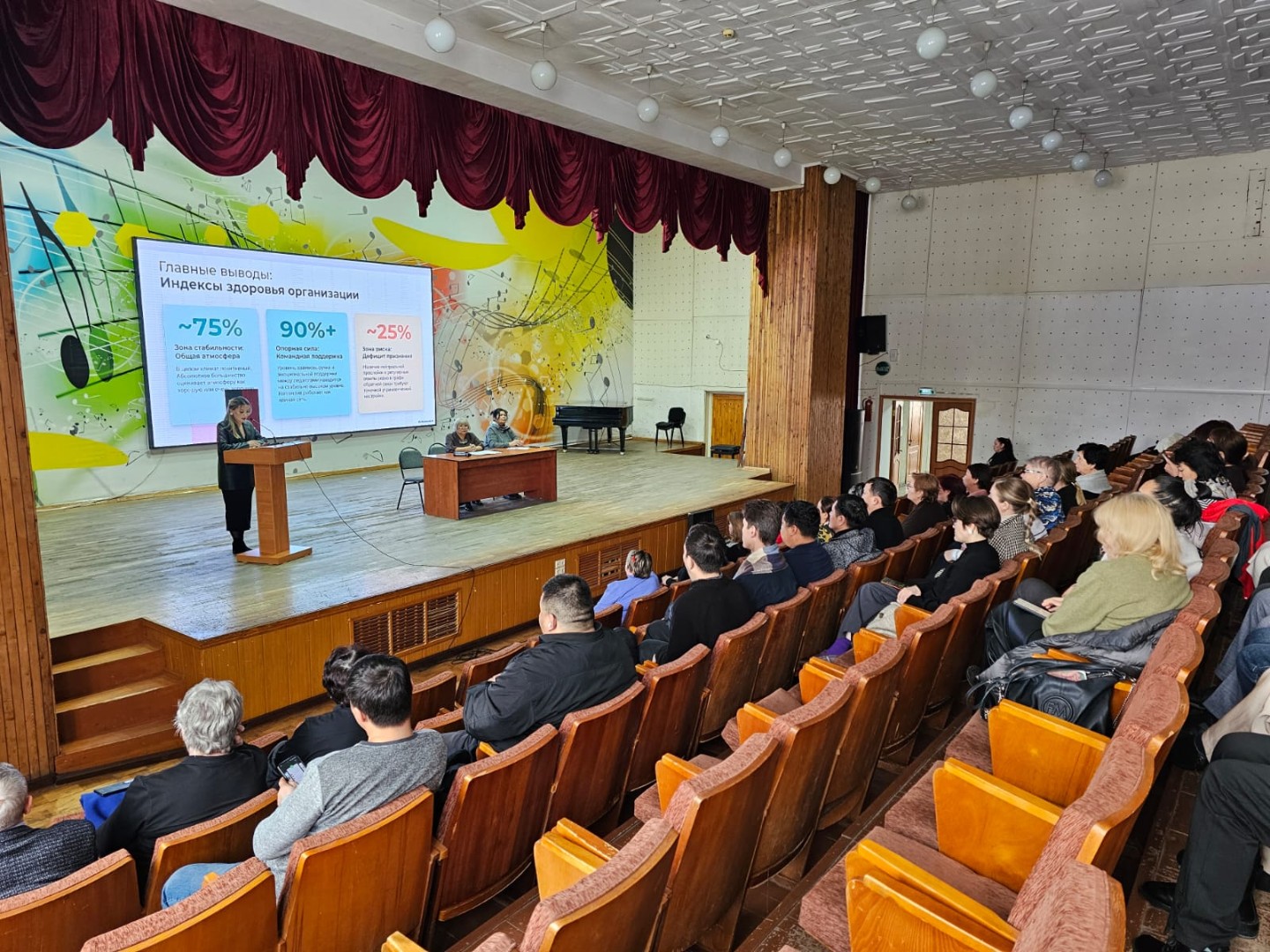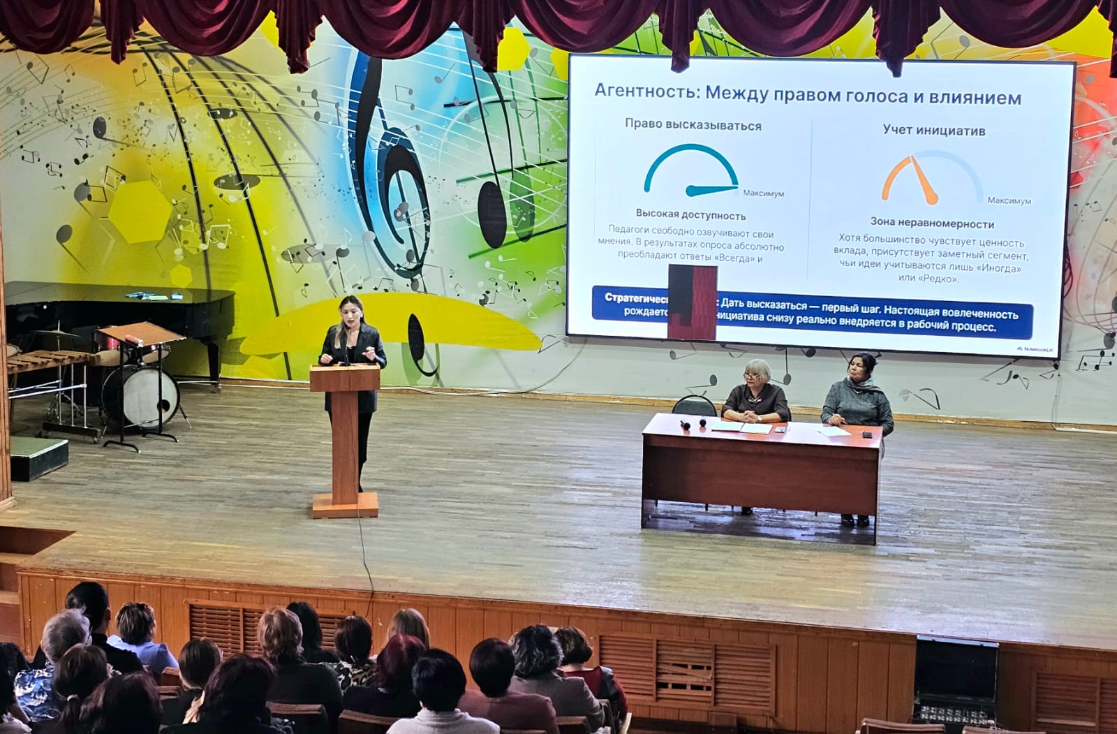 Педагог-психолог Ермағамбетова Альмира Уатқанқызы «Қызметкерлердің және ұйымның дамуына жол ашатын қолайлы психоәлеуметтік жұмыс ортасы» тақырыбында баяндама жасап, педагогтар мен білім алушылар үшін қолайлы әрі қауіпсіз еңбек жағдайларын қалыптастырудың маңыздылығын атап өтті.