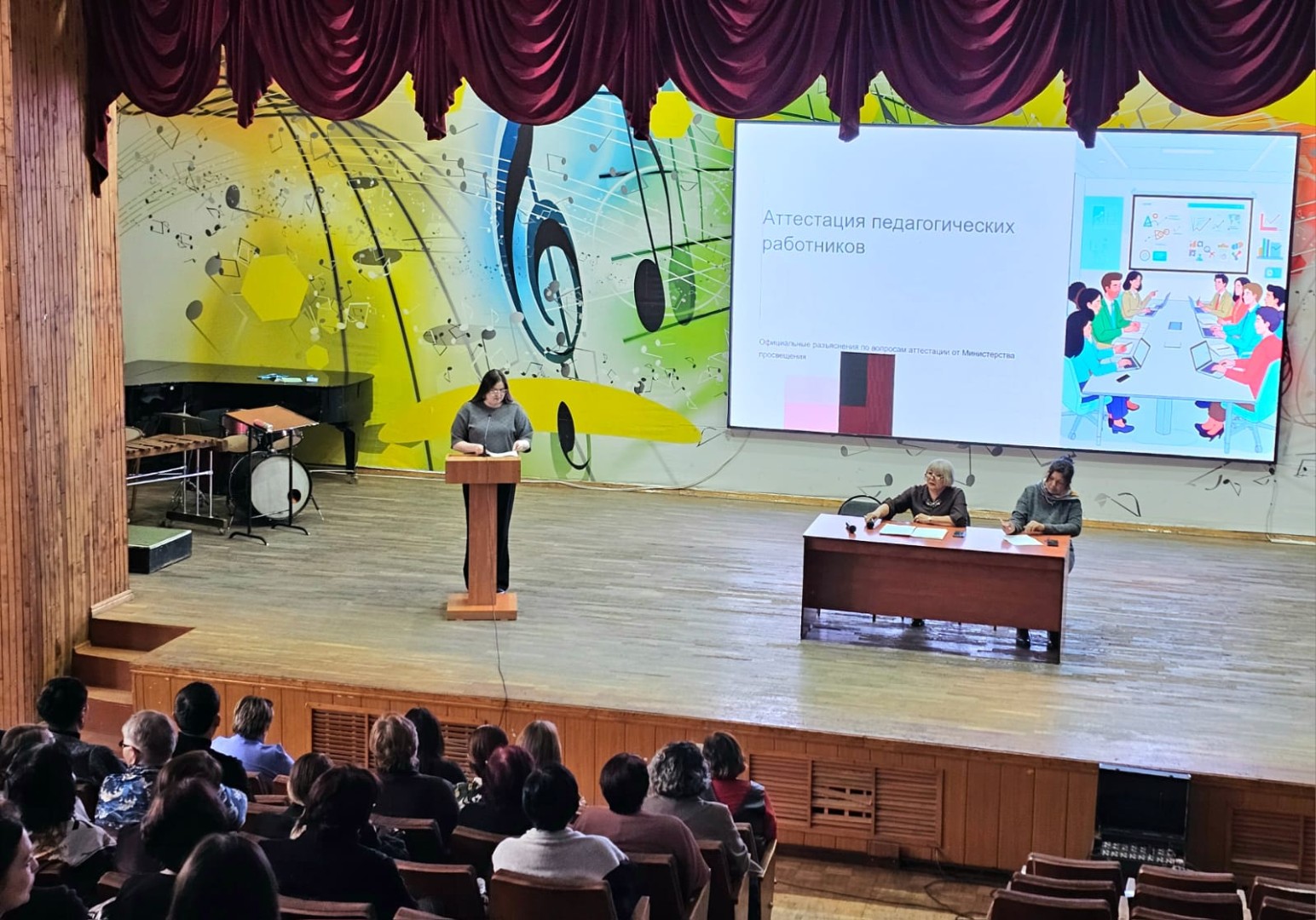 Училище директоры Дюсупова А.О. «Училище оқытушыларының педагогикалық этиканы сақтауы» тақырыбында баяндама жасап, білім беру үдерісіндегі кәсіби мінез-құлықтың, педагогикалық әдеп пен жауапкершіліктің маңыздылығын ерекше атап өтті.