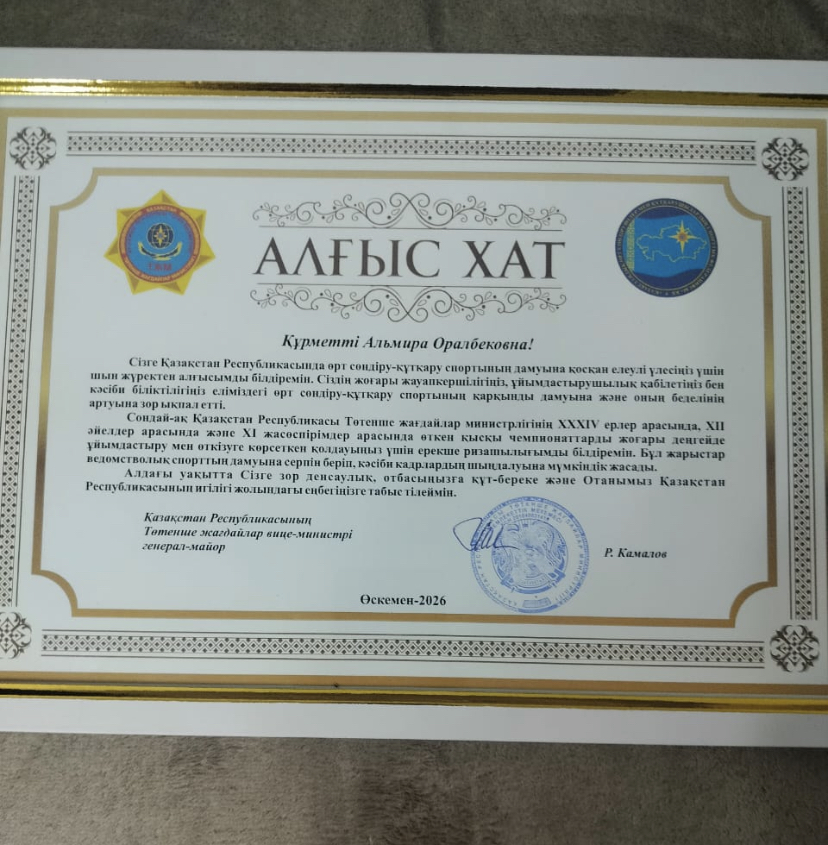 20 марта 2026 года на торжественной церемонии награждения победителей зимнего чемпионата МЧС РК по пожарно-спасательному спорту, директору ВКУИ имени народных артистов братьев Абдуллиных Дюсуповой А.О. было вручено Благодарственное письмо за подписью вице-министра по чрезвычайным ситуациям Республики Казахстан генерал-майора Камалова Р.